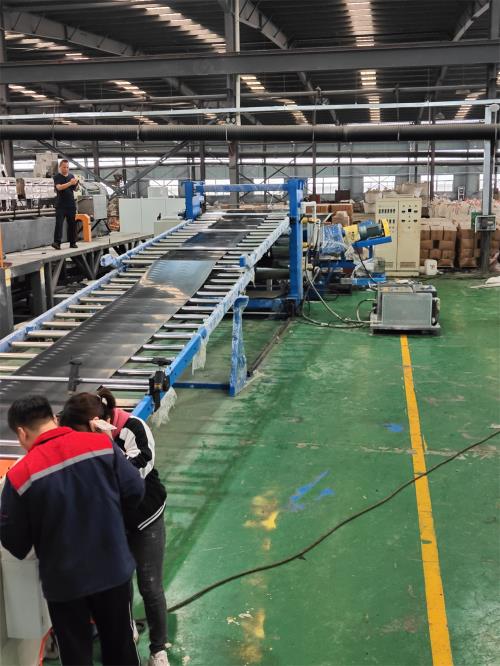 牽引電機(jī)功率:1.5kw,壓輥為橡膠輥,主動(dòng)輥為橡膠輥牽引牽引輥直徑:φ150mm牽引被動(dòng)輥有效提升距離為:50mm2) 托架總長10米.,一步成型片材擠出機(jī)_一步成型片材生產(chǎn)線分兩段,方管結(jié)構(gòu)。過渡冷卻輥材質(zhì):φ63不銹鋼,輥面寬度1100mm3) 兩側(cè)兩把切刀可有效切除廢料,使片材達(dá)到所需要的寬度,安裝刀片的刀桿上帶鍵槽;方便統(tǒng)一調(diào)整刀的角度4) 調(diào)節(jié)切邊刀;托架平臺一件;平臺寬400mm.平臺表面帶帶防滑;人蹬在上門方便調(diào)節(jié)刀片;帶上下樓梯;帶扶手(扶手的顏色為安全色:黃色)(六)JDL-1500剪板機(jī)1) 最大剪板寬度:1100mm.最大厚度:6mm,剪切速度,60次/分。剪板方式:機(jī)械剪板,電機(jī)功率2.2kw(定制) 2)輸送帶1500×1500mm,輸送電機(jī)0.75kw,線速度0-12m/m,橡膠輸送帶要帶槽道;防止輸送帶跑偏