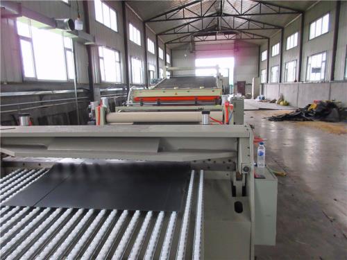 上放卷安裝在三輥頂部;三輥頂部要做平臺;平臺可以拆卸;平臺四周要扶手;扶手是可以拆裝;扶手為安全色(黃色);要有上下樓梯;樓梯安裝用扶手;樓梯下面安裝萬向輪;能與三輥同時移動;雙工位;放卷速度采用磁粉控制;在最上面三輥的平臺的支架上支出200mm;安裝個托架的支架;防止上放卷在放無紡布是不能上面的三輥接觸;上平臺加大;2)下放卷安裝與托架下; 雙工位放卷; 放卷速度采用隔音片材生產(chǎn)線磁粉控制;下放卷架子與三輥底座為螺絲連接;與三輥能同步前后移動; 在最下面三輥的支架安裝個托架的支架;防止下放卷在放無紡布是不能與輥筒摩擦;3)上下覆膜系統(tǒng)加張力控制:采用磁粉控制器控制張力4)上下覆膜系統(tǒng)里面加左右可以調(diào)整;調(diào)整距離:50mm(九)冷卻牽引切邊裝置1) 牽引電機功率:1.5kw, 壓輥為橡膠輥,主動輥為橡膠輥牽引 牽引輥直徑:φ150mm牽引被動輥有效提升距離為:50mm2) 托架總長12米.,分兩段,方管結(jié)構(gòu)。過渡冷卻輥材質(zhì):φ63隔音片材生產(chǎn)線不銹鋼,輥面寬度2300mm3) 兩側(cè)兩把切刀可有效切除廢料,使片材達到所需要的寬度,安裝刀片的刀桿上帶鍵槽;方便統(tǒng)一調(diào)整刀的角度4) 調(diào)節(jié)切邊刀;托架平臺一件;平臺寬400mm.平臺表面帶帶防滑;人蹬在上門方便調(diào)節(jié)刀片;帶上下樓梯;帶扶手(扶手的顏色為安全色:黃色)(十)JDL-2300剪板機1) 最大剪板寬度:2300mm.最大厚度:6mm,隔音片材生產(chǎn)線剪切速度,60次/分。剪板方式:機械剪板,電機功率2.2kw(定制2)輸送帶2500×2000mm,輸送電機0.75kw,線速度0-12m/m,橡膠輸送帶要帶槽道;防止輸送帶跑偏