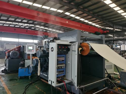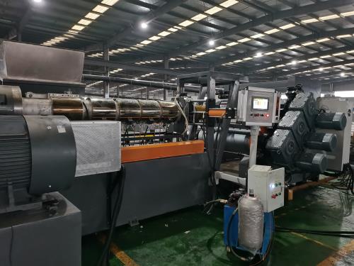 交流電機;功率:132kw; “利多”電機,三晶或羅賓漢變頻調(diào)速器3、螺桿1)直徑:φ150mm;長徑比:35:1;材質(zhì)為38CrMoALA氮化處理,氮化HRC65-70,深 0.6-0.75mm,脆性不大于II級。螺桿表面鍍硬鉻處理;排氣孔之前1M長的螺桿表面螺棱噴硬質(zhì)合金,提高耐磨度。2)螺桿芯部通水冷卻;4、料筒1)材質(zhì)為38CrMoALA氮化處理,氮化HV950-1050,深0.6-0.75mm,脆性不大于II級;2)螺筒采用水冷卻;筒體上開槽,盤銅管,通冷卻油;螺筒上加防護罩,不銹鋼材質(zhì);3) 加熱區(qū)段:采用優(yōu)質(zhì)鑄鋁加熱器5、水冷卻系統(tǒng)1)水泵泵電機功率:0.75kw;自動控水電磁閥;手動閥用銅閘閥控制;加大水流量,2)采用環(huán)保風(fēng)冷卻系統(tǒng)(環(huán)保型:發(fā)明專利號:CN201911312134.6)不需要接外循環(huán)水冷卻,不用徘外水;采用閉環(huán)循環(huán)系統(tǒng)6、抽真空系統(tǒng):1)真空泵功率:2.2kw;抽真空水箱為不銹鋼材質(zhì);隔音片材生產(chǎn)線2)采用環(huán)保風(fēng)冷卻系統(tǒng)(環(huán)保型:發(fā)明專利號:CN201911312115.3)不需要接外循環(huán)水冷卻,采用閉環(huán)循環(huán)系統(tǒng)7、液壓板式自動換網(wǎng)系統(tǒng):1)位置:固定位置在機筒出料端和機頭之間;3)液壓缸、液壓站等一套,采用YA-N46抗磨46#液壓油;(油品需客戶自行采購)隔音片材生產(chǎn)線